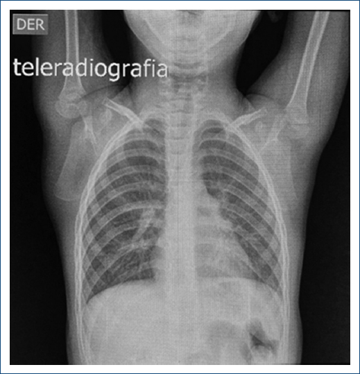 Figure 1. Posteroanterior chest radiograph with a normal cardiothoracic index and button excavation pulmonar.